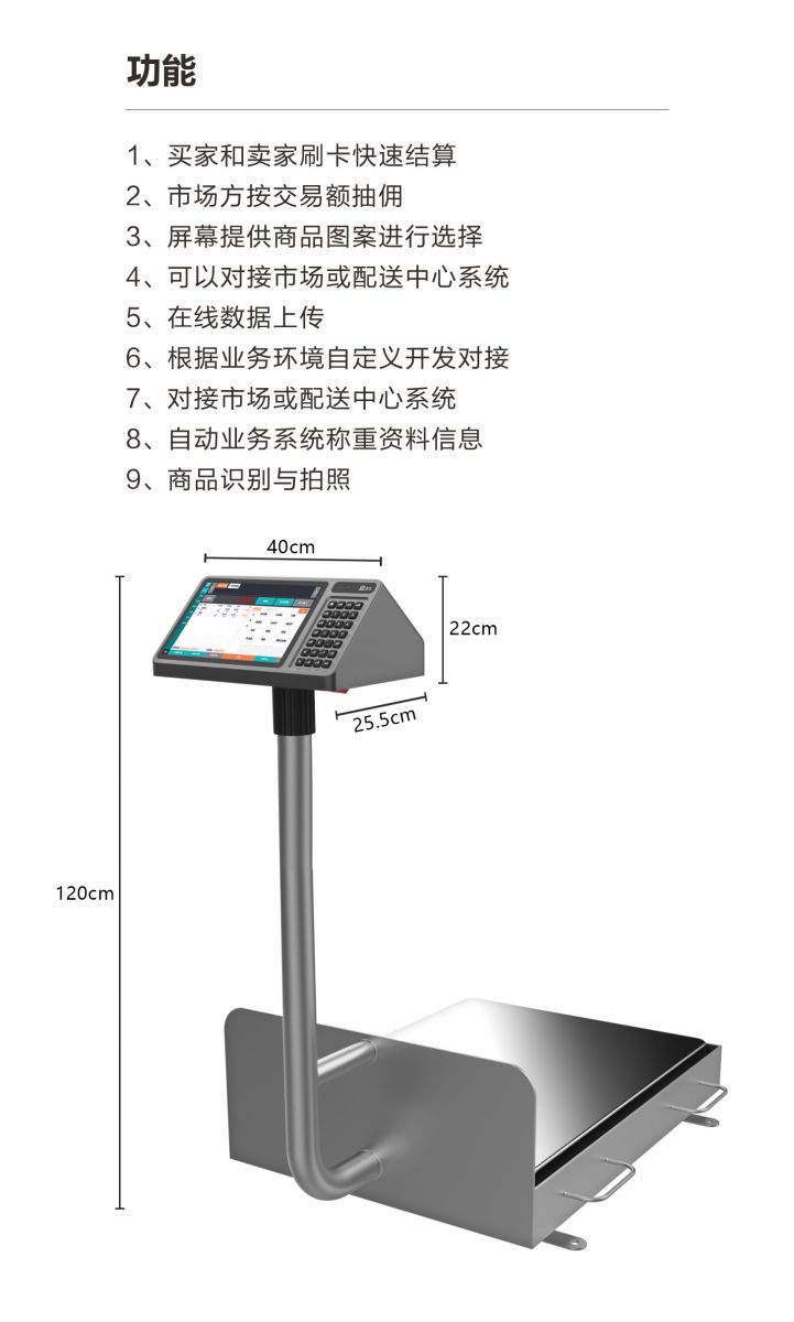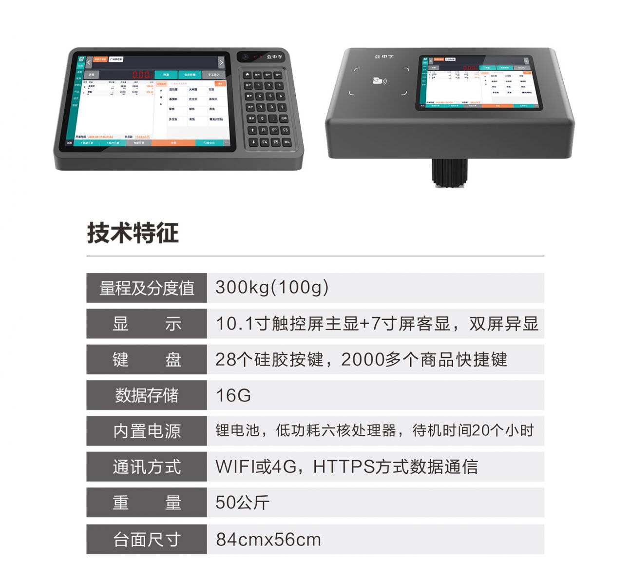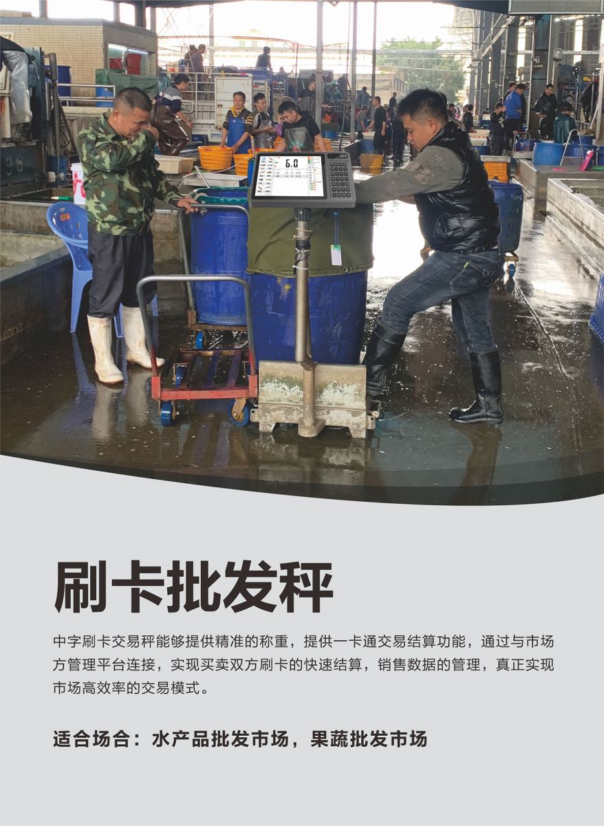中字智能刷卡一体批发秤——专业水产农贸批发秤。支持“开单/记账/进销存”等功能;支持卖家一对多买家进行开单的销售方式;支持一卡通交易结算功能,买卖双方刷卡快速结算,实现市场高效率的交易模式;采用WIFI或4G、HTTPS通信方式传输数据;超清全彩液晶10.1寸触摸主显屏和7寸客显屏,清晰且大方;IP68全防水设计;16G超大数据存储空间;内置24000mAH蓄电池,断电可待机20小时;符合国家计量部门规定要求达到精度:1/3000;执行标准:GB/T 7722-2020。